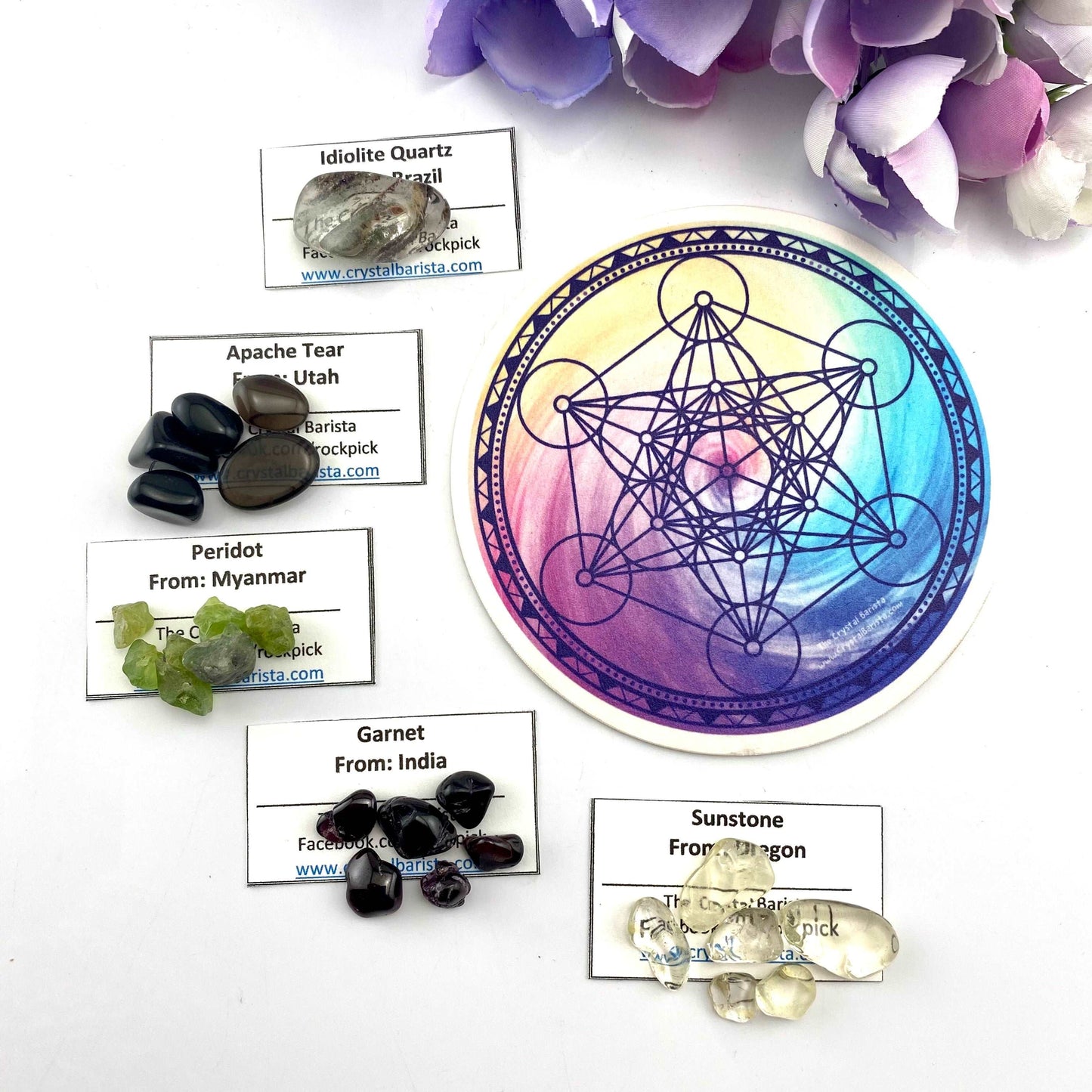 About Crystal Grids: These wonderful little grid sets are the perfect way to experiment and learn about powerful uses of crystal grids and sacred geometry. You do not need to know anything about crystal grids to begin laying stones, herbs, and flowers on top of them and feel the energies they creat. Experiment until you find the energy that is right for you is an ideal start on the journey to Crystal Grid mastery.