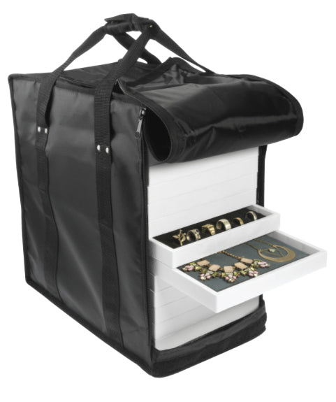 Transporting your Valuables will be a Breeze with our Fourteen Tray Carrying Case. This hand carried case has a Foam-lined interior and is constructed with a durable 1680D PVC exterior to repel water and dust Particles.This case is made to fit (14) standard 15"x83/8"x1" Jewelry Trays.