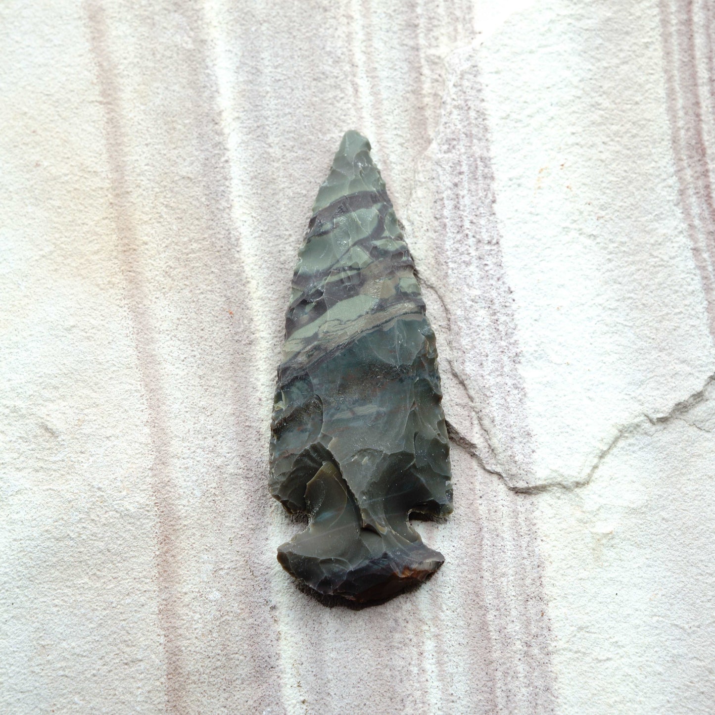 Extra-large arrowhead, knapped from rainbow chert found in Madagascar. Collection sizes range from 3 to 4.5 inches.